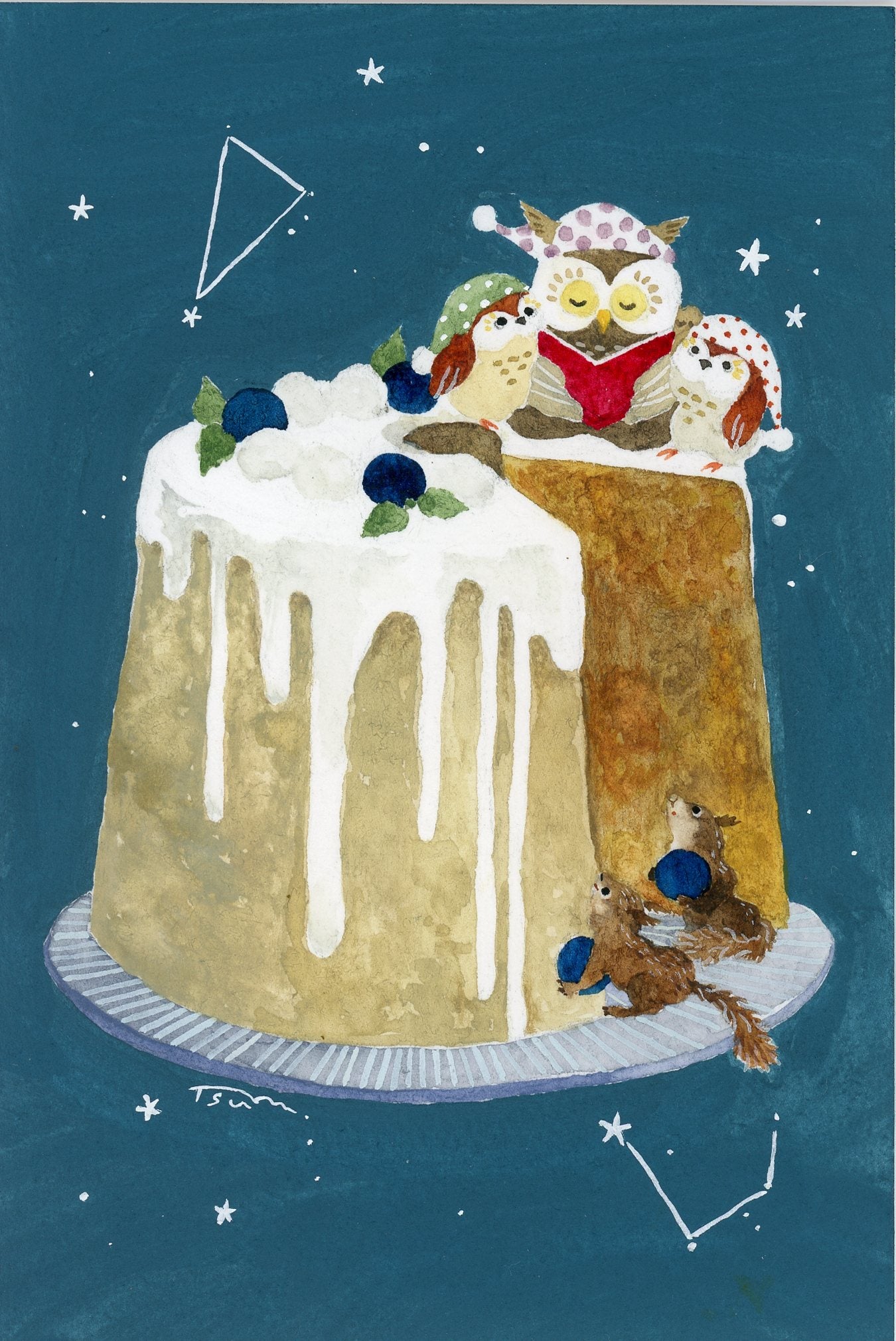 フクロウたちの穏やかな夜がテーマです。夜の風にほんのり秋の空気を感じるような深い色を重ねました。子どもたちはやわらかなお膝で眠る前の絵本の時間。ふかふかなシフォンケーキの上で、お菓子のお話を読んでいるのかも?もしかしたら、お菓子の夢を見ているのかもしれません。そんな想像をしながら制作しました。